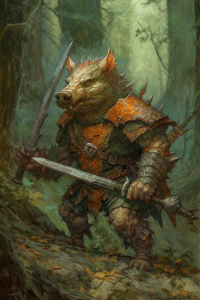 A new kind of demon has appeared in the lands of man, often accompanying Korrgai warbands; it is larger, stronger, faster and more aggressive than the regular Korrgai, but shares the same pig-like attributes. The knights of the Sacred Swords are investigating the matter, but it is not yet clear what dark sorcery is responsible for that. The knights call these beasts Uldugai.